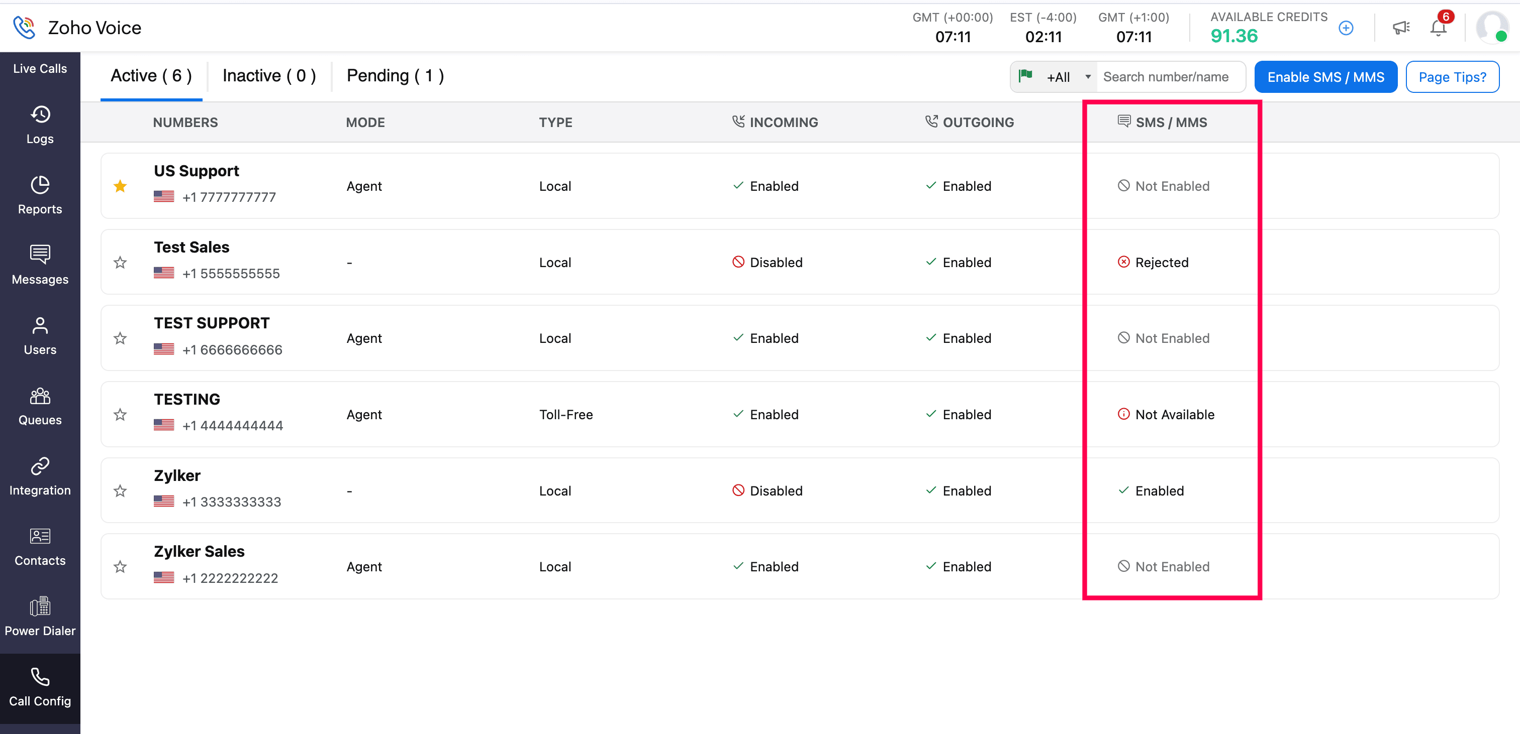 On the Call Config page, you can review information about all the phone numbers you've acquired. If SMS/MMS is not activated for a specific number, the SMS/MMS column will show Not Enabled. If the SMS/MMS column indicates Not Available, it means that SMS cannot be enabled for that particular number.