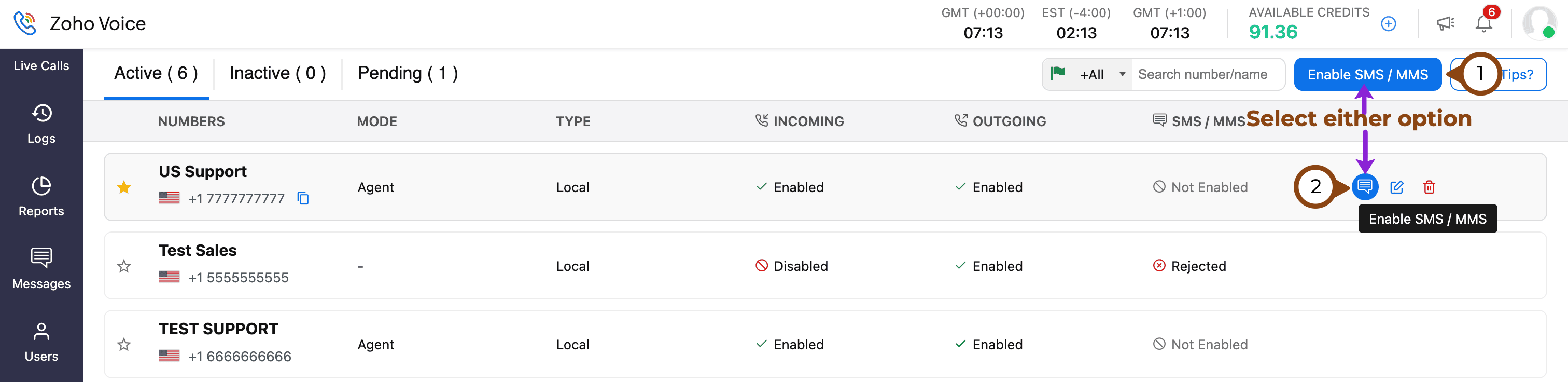 • Hover over the number you want to enable SMS/MMS for and click the Enable SMS/MMS icon.