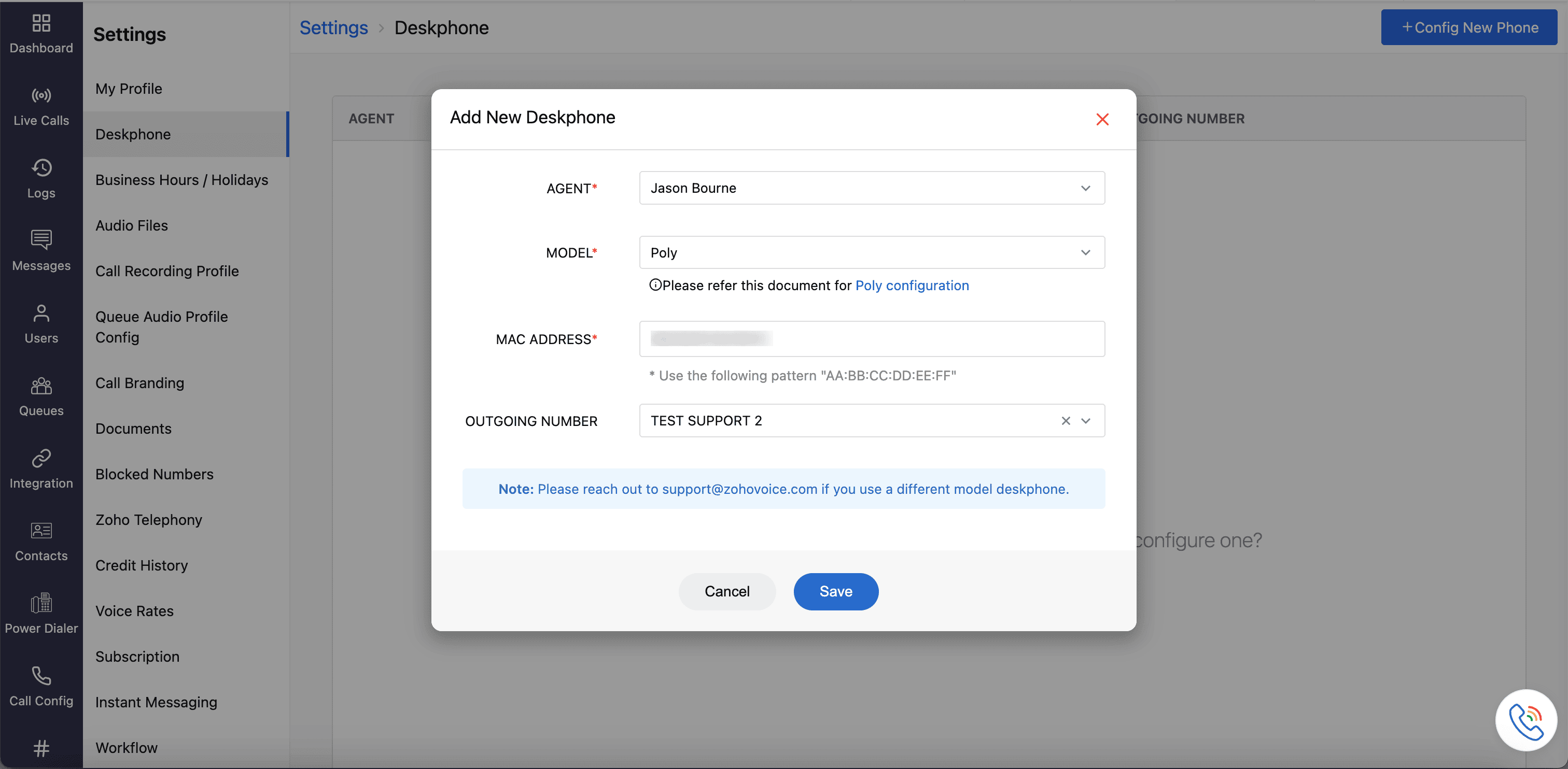 In the Add New Deskphone prompt, select the agent to whom you want to configure the desk phone and select the model as Poly.