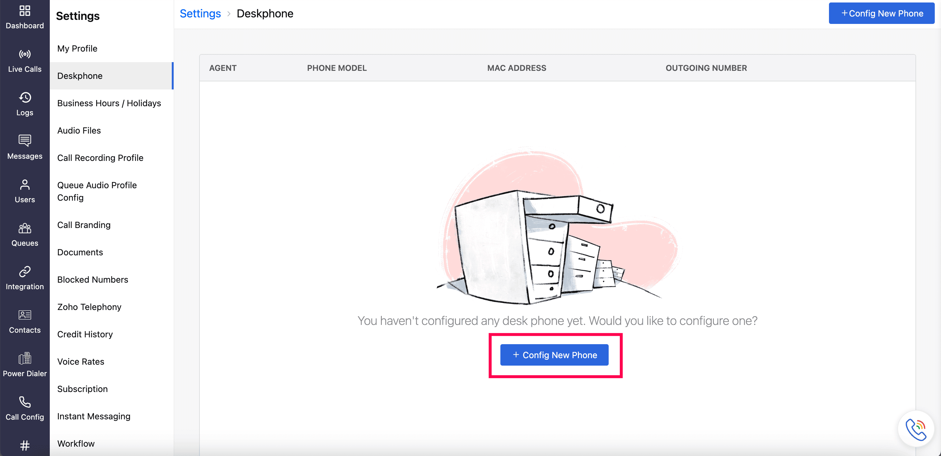 Go to Settings → Deskphone and click Config New Phone.