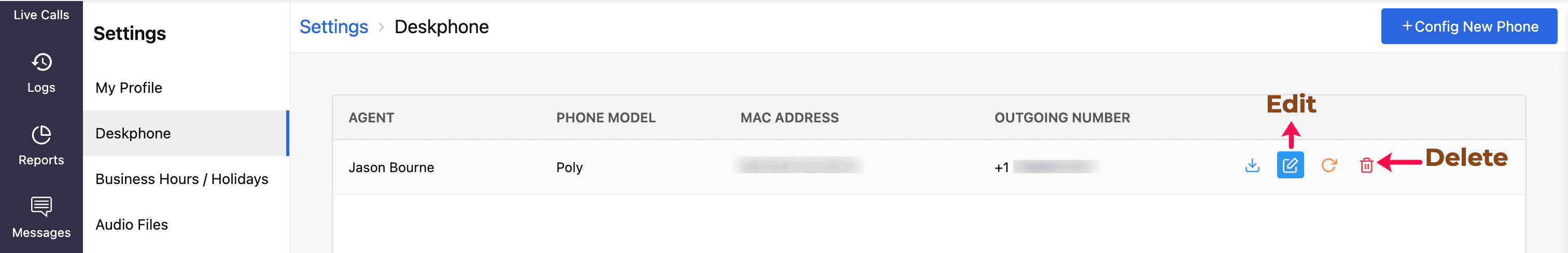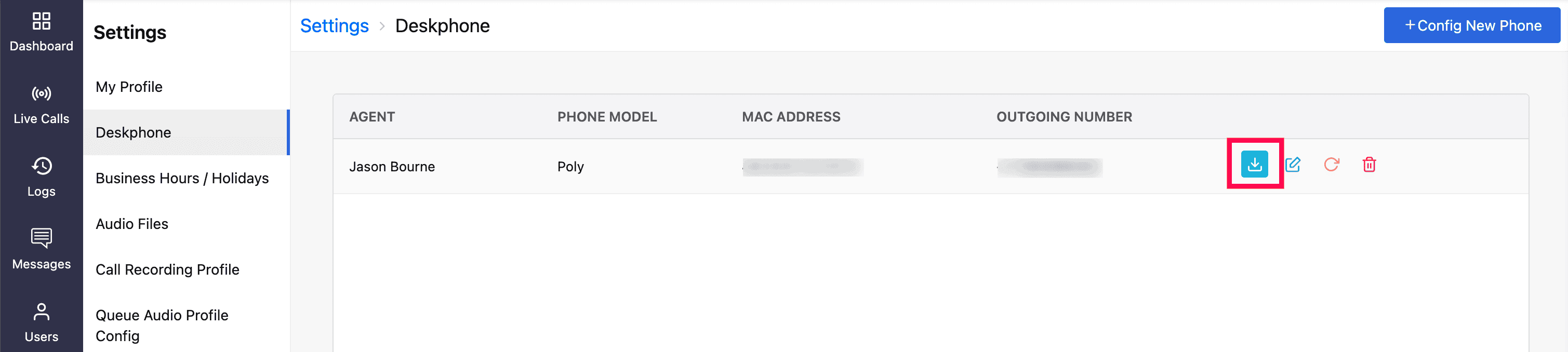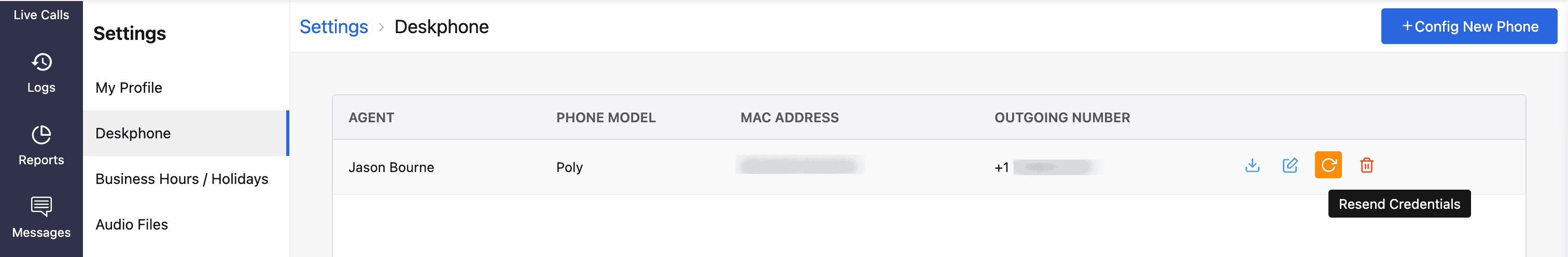 The saved configuration will appear on the Deskphone homepage. The agent specified in the configuration will receive an email with their SIP authentication details. If they haven’t received it, click the Reload (Resend Credentials) icon to resend the credentials.
