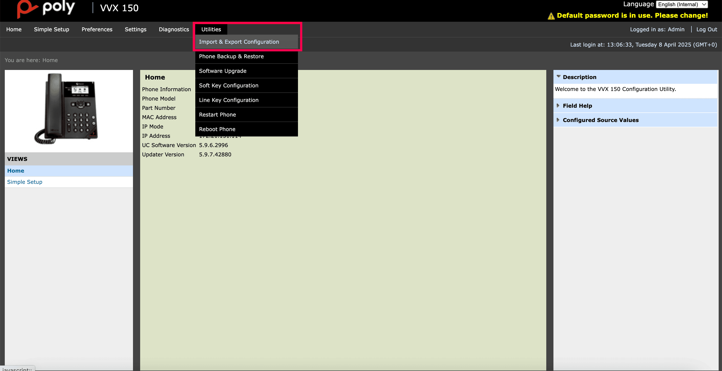 Once you have obtained the IP address, Enter the IP address in your browser (e.g., https://192.168.0.10 or 192.168.0.10). This will take you to your Poly desk phone's web UI.