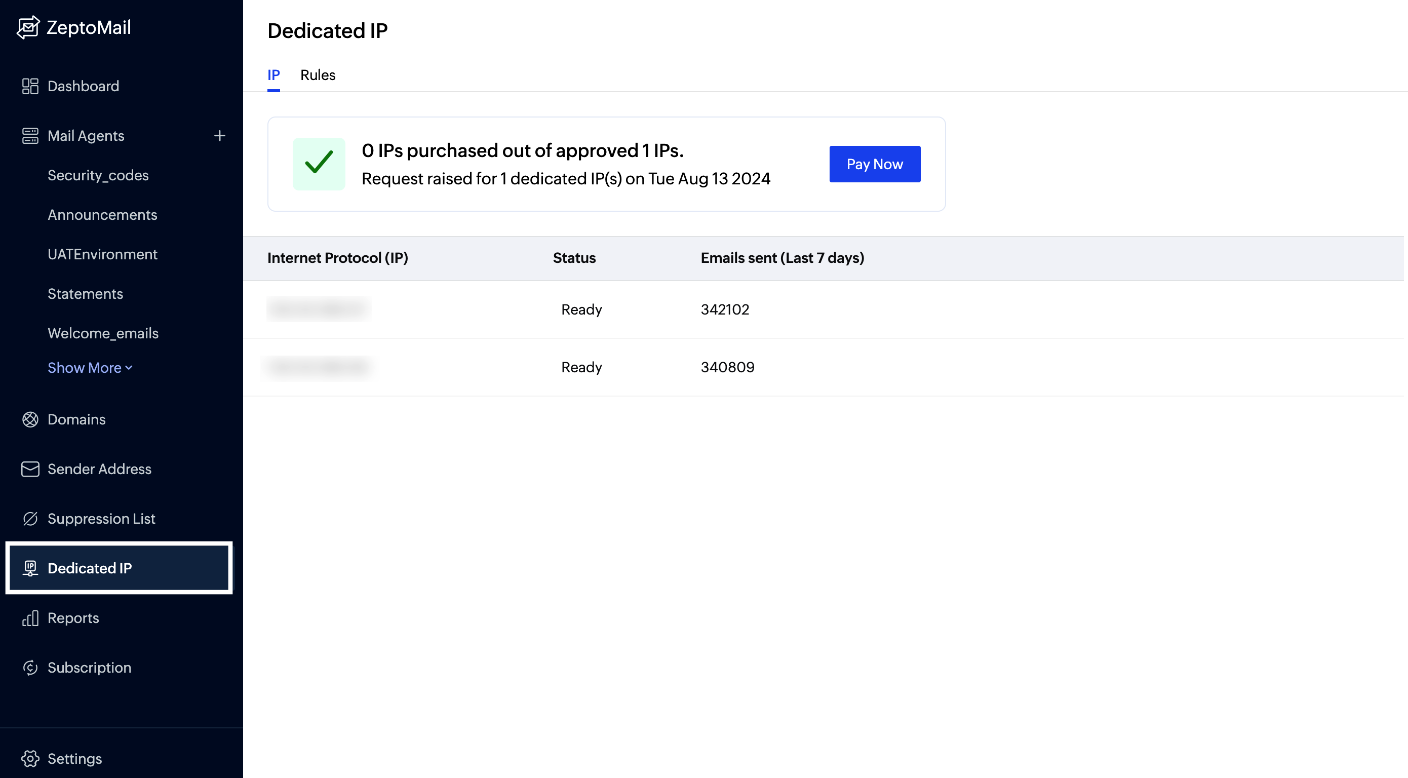 Dedicated IP is rolled out in a phased manner across data centres. To know the availability of dedicated IP in your region, contact support@zeptomail.com.