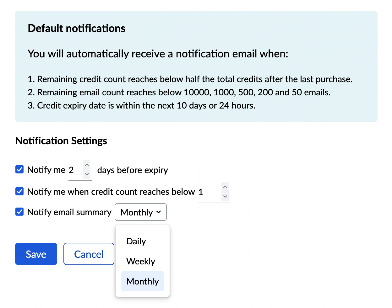 You can set reminders for your credit purchases in the Notification settings section. By default, you will receive notification emails when :